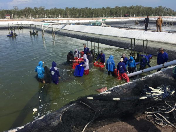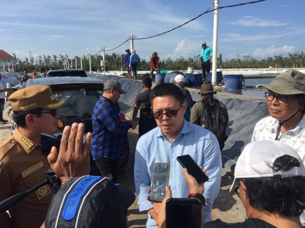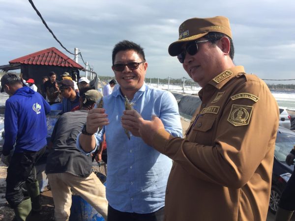 menyaksikan panen perdana udang Vaname di PT Berkah Akuakultur Bahari di gusong cine RT:29 Desa Batu Penyu Kecamatan Gantung,Senen (15/9/2025).