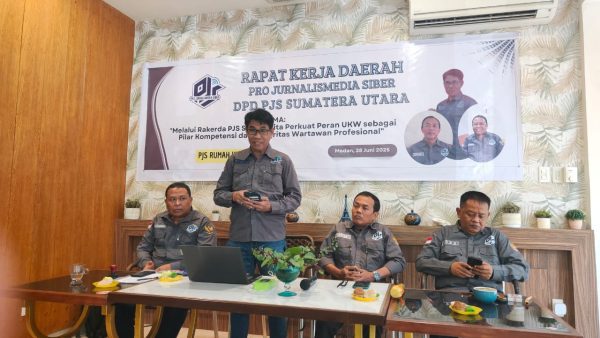 MEDAN, SUMUT – Dewan Pimpinan Daerah (DPD) Pro Jurnalismedia Siber (PJS) Sumatera Utara menggelar Rapat Kerja Daerah (Rakerda) I yang dibuka langsung oleh Ketua Umum Dewan Pimpinan Pusat (DPP) PJS, Mahmud Marhaba, bertempat di Deli Kede Kopi, Jalan Dolok Sanggul, Medan, Sabtu (28/6/2025).