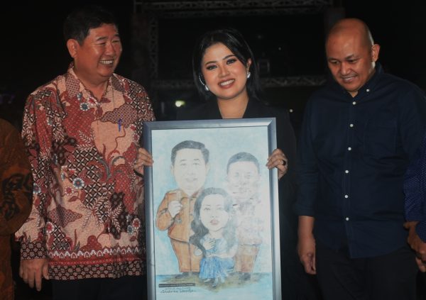 Pada kesempatan ini pula, Bupati bersama Forkopimda menyerahkan lukisan karikatur. Tampak di lukisan tersebut, terdapat Shabrina beserta Bupati dan Wakil Bupati Beltim, Khairil Anwar. (Yohanes korankpk)